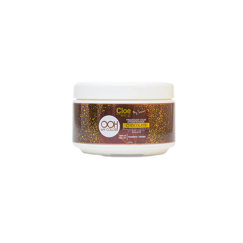 MASCARA INTENSIFICADORA DE CHOCOLATE – PROGRESSIVE COLOR INTENSIFIER MASK 270 GR CHOCOLATE, máscara intensificadora progresiva de color de CLOE PROFESSIONAL para cabellos tinturados en CHOCOLATE, que permiten lucir cabellos con pigmentación más intensa y duradera, aminorando el deslave del pigmento hasta el siguiente retoque en salón. Su fórmula incluye PIGMENTOS BÁSICOS, los cuales tienen un deslave más lento y pueden utilizarse en coloración temporal, semi permanente y permanente con oxidantes. Su tamaño de partícula permite ingresar y depositarse tanto en el córtex como en la cutícula del cabello, lo que brinda una mayor fijación del pigmento a diferencia de los demás tipos de pigmentos. Además, esta increíble fórmula se encuentra potenciada con Transcutol, Mango, Aceites Naturales y Aminoácidos, los cuales conjuntamente además de permitir una mejor fijación del pigmento, mejoran la calidad del cabello entregando un alto poder nutritivo restaurador, brillo, hidratación natural, fuerza y elasticidad en cada hebra capilar.