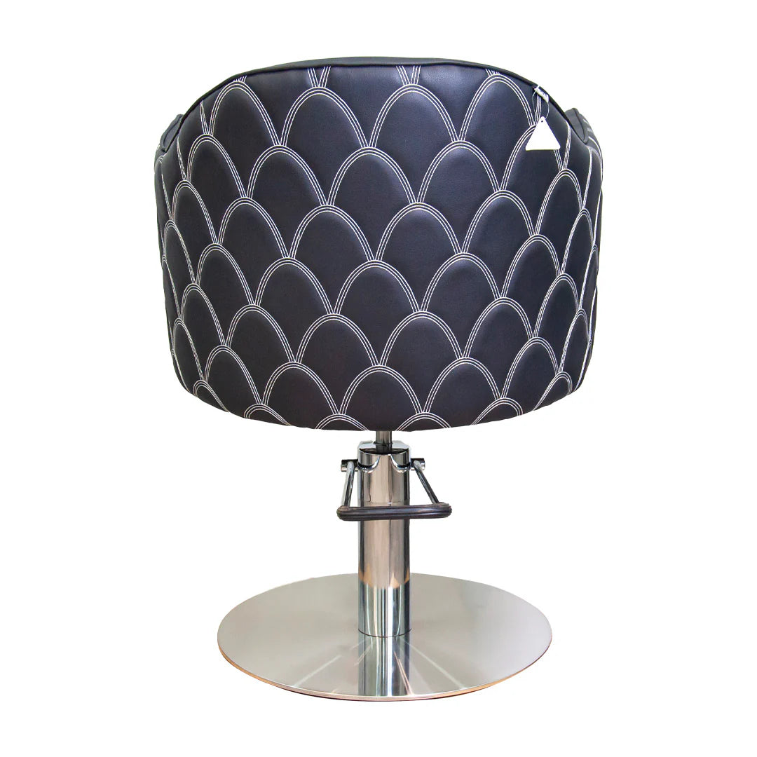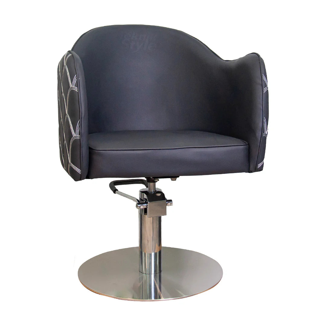 Es hidráulico, tiene apoya brazos acolchados, tapiz de alto tráfico de color negro con detalles bordados en hilos blancos, y base redonda pulida.